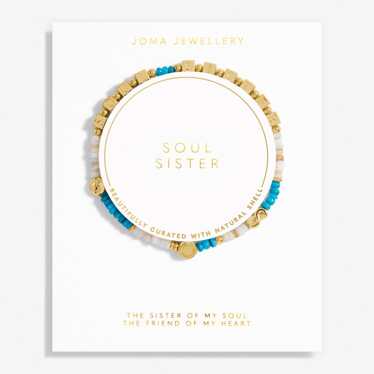 Bursting with colour and charm, this gold-plated bracelet features natural shells, playful alphabet beads spelling out 'Soul Sister', and delicate charms — capturing the spirit of joyful friendship.
