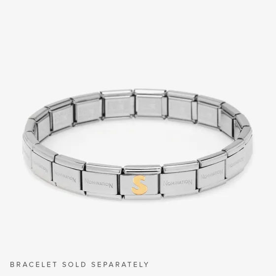 Original Charm for Nomination's Composable Classic Bracelet with Letter S Alphabet symbol in stainless steel and bonded yellow gold. Available Charm versions: A-Z. Made in Italy. Add your loved one's initials to your bracelet!