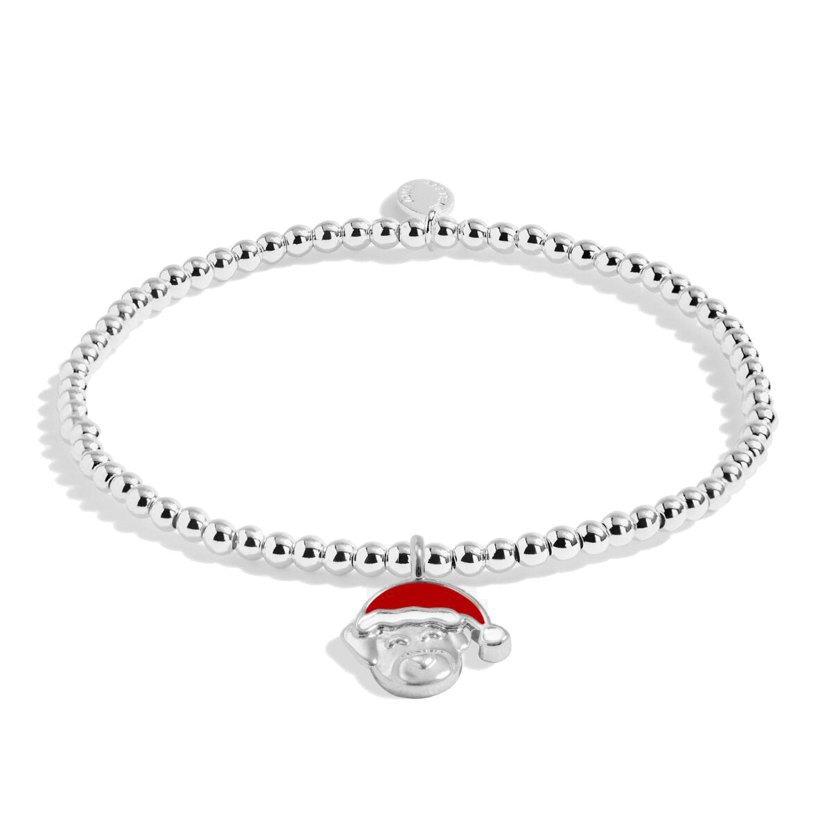 Threaded with classic silver-plated beads, this bracelet features an adorable puppy face charm wearing a Santa hat. Designed for smaller wrists, it is lovingly presented on a shimmering starburst-print card, framed by a sweet festive poem. This charming bracelet is sure to be a delightful stocking filler or under-the-tree gift.
