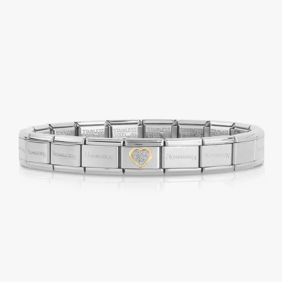 Nomination Italy classic Gold collection is a unique modular composable series. Links blend stainless steel with 18k gold elements, including enamel, semi-precious stones, and cubic zirconia. Design your Bracelet with names, occasions, and meaningful symbols.