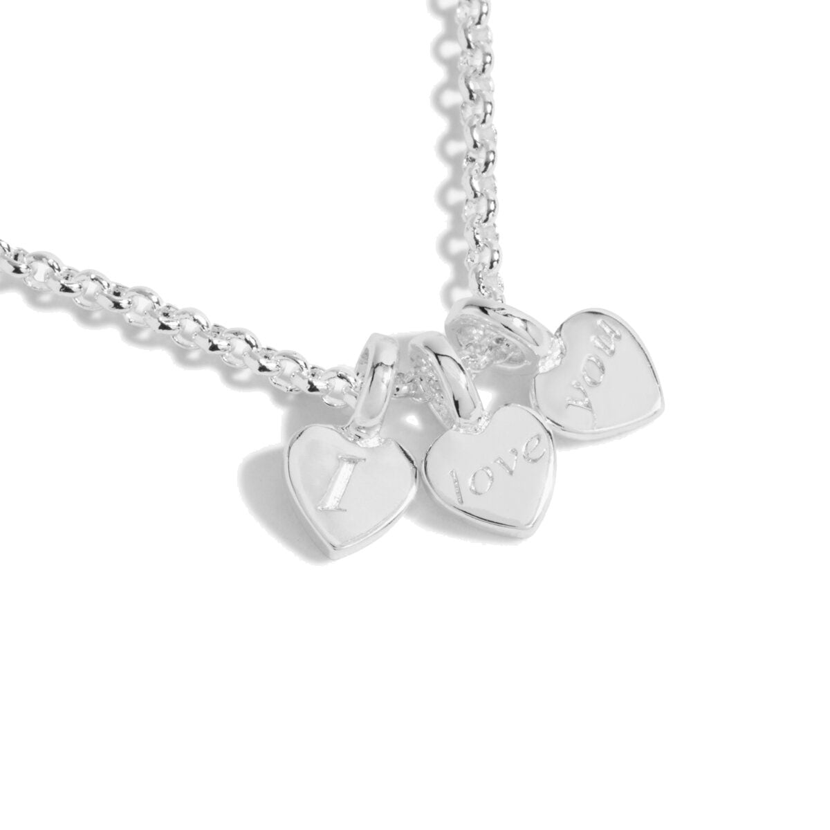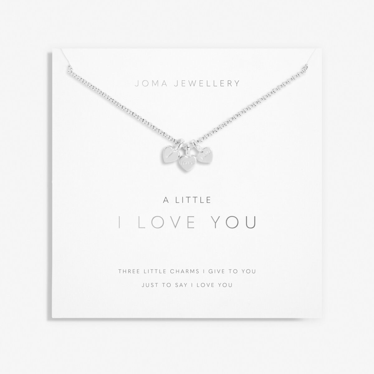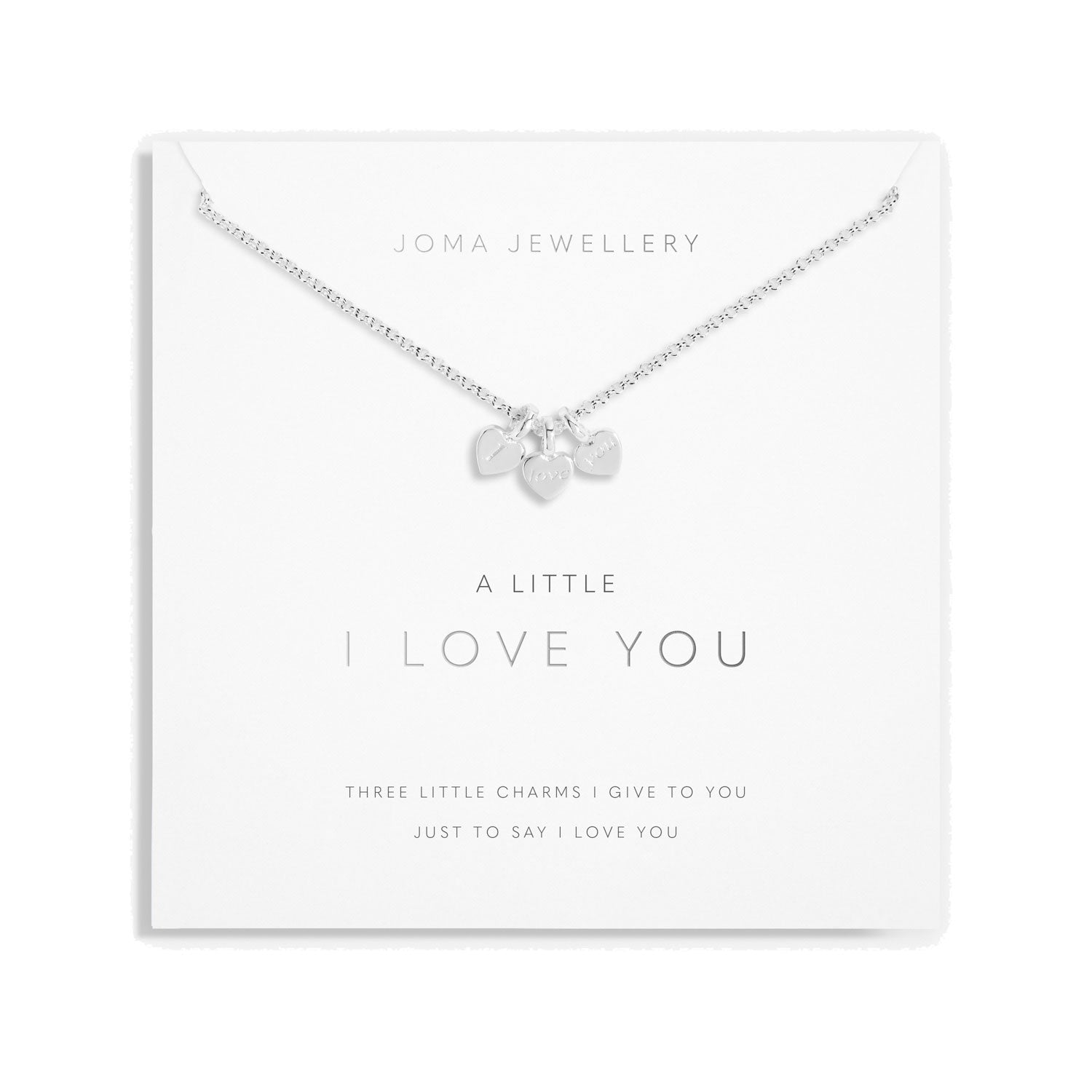 Experience the heartfelt expression of love with the Joma Jewellery A Little 'I Love You' Necklace. This exquisite necklace features an elegant silver-plated chain adorned with three delicate heart-shaped charms, lovingly engraved with the words "I love you." It's not just a piece of jewelry; it's a symbol of affection, a token of appreciation, and a reminder of the bond you share.