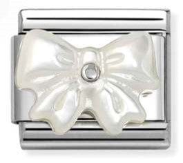 This elegant composable silver charm combines stainless steel and 925 sterling silver, featuring a delicate white mother of pearl bow. Its timeless design makes it a beautiful choice for celebrating special moments or adding a touch of sophistication to your nomination classic bracelet.