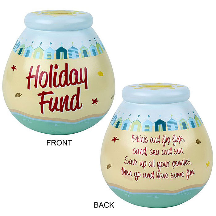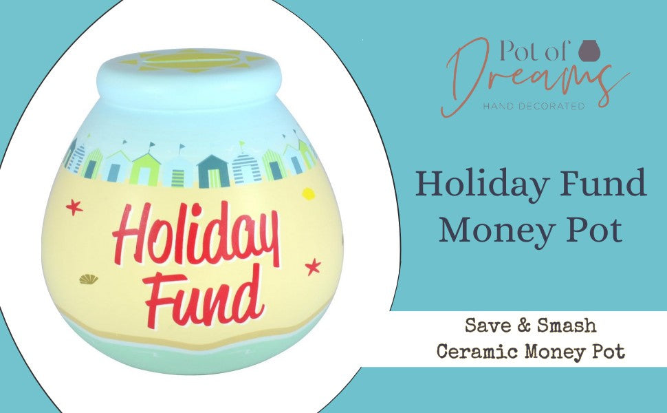 Escape to your dream destination with the Holiday Fund Pot of Dreams money pot. Featuring a cheerful beach hut design and sun-soaked coastal colors, this ceramic savings pot brings vacation vibes right into your home.