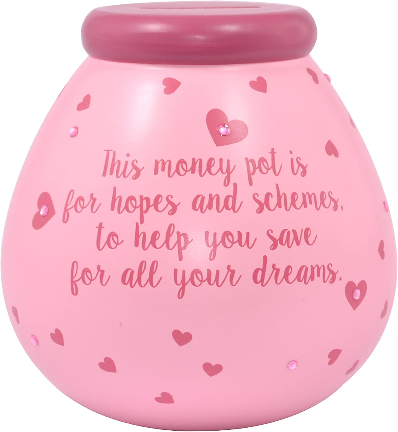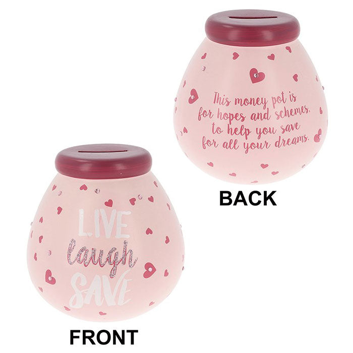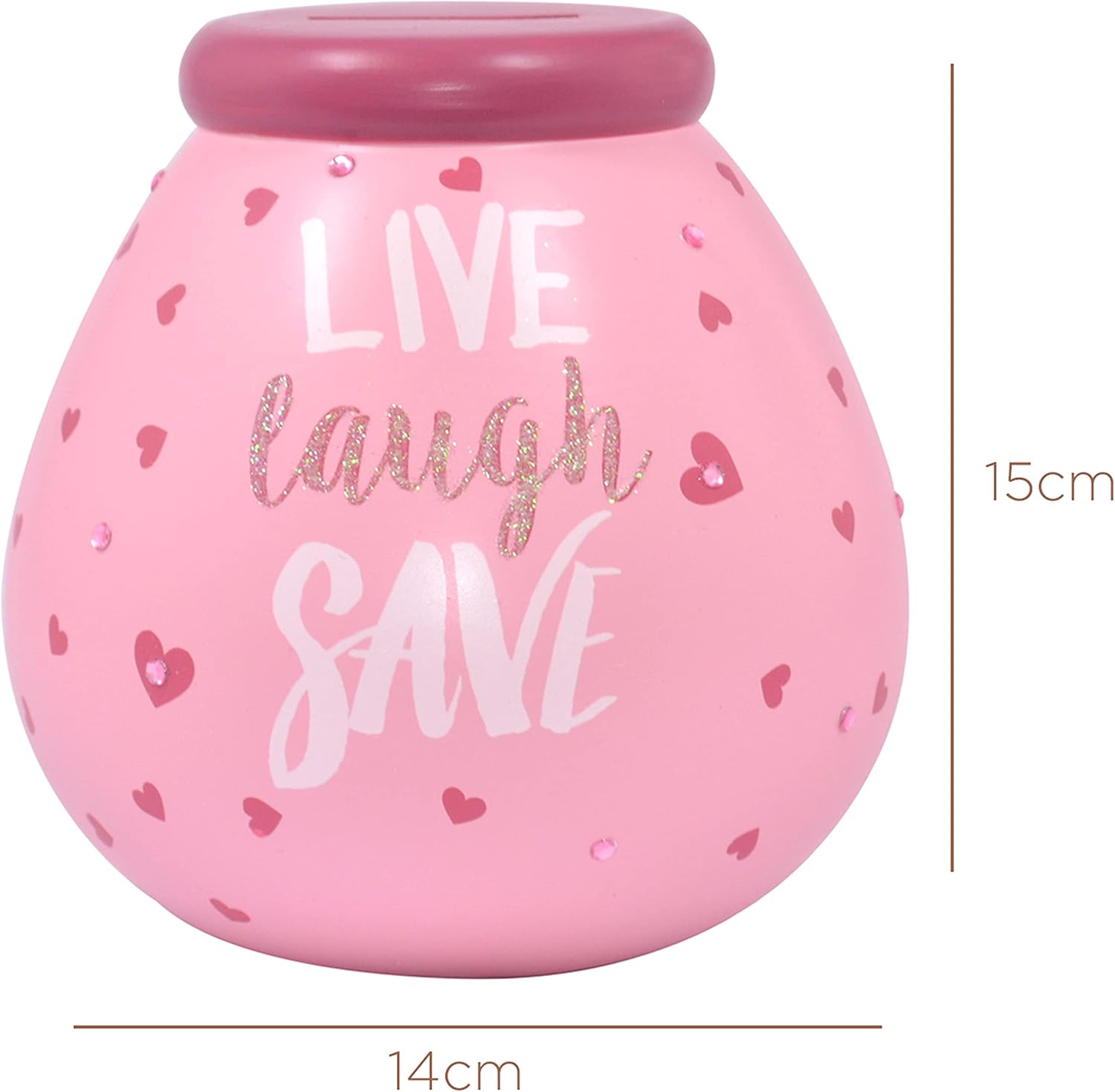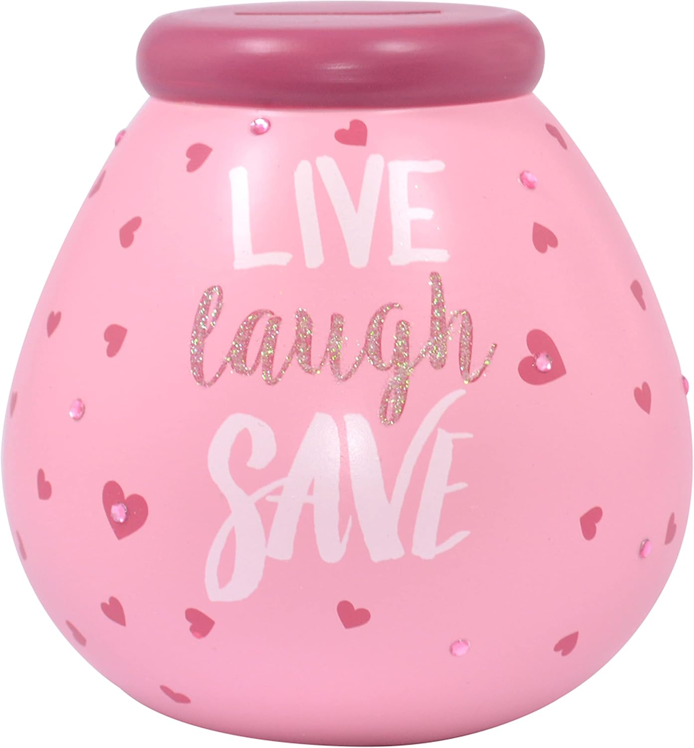 A playful twist on a beloved life mantra, this pink-hued ceramic money pot sparkles with joy, featuring delicate diamante accents and the uplifting phrase “Live, Laugh, Save.” It's more than décor—it’s a daily reminder to stay positive while working toward your dreams. With space to hold up to £1000 in £1 coins, it’s the perfect way to save for something special while keeping temptation at bay. A thoughtful gift or motivational treat, this pot turns small change into big goals—with a joyful attitude.