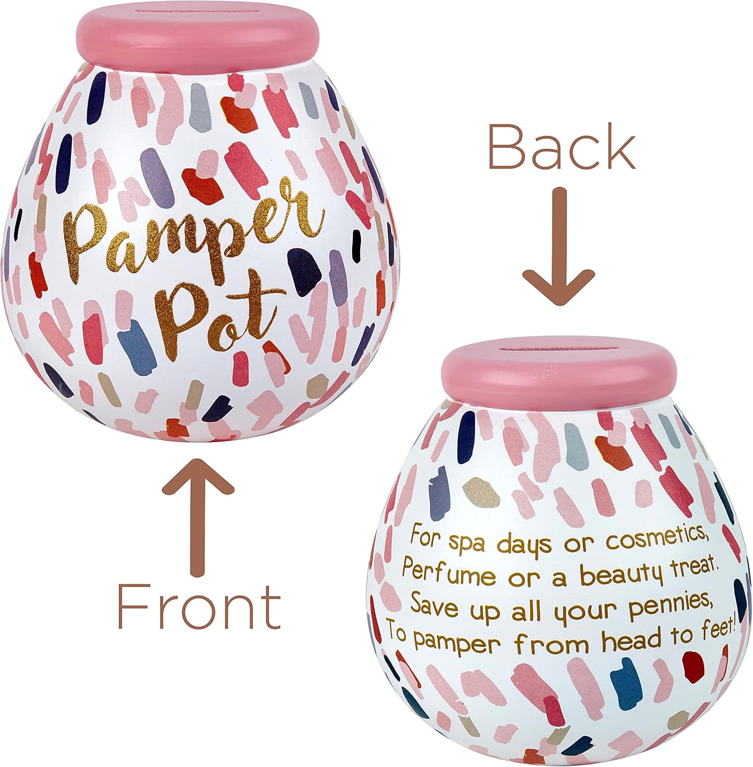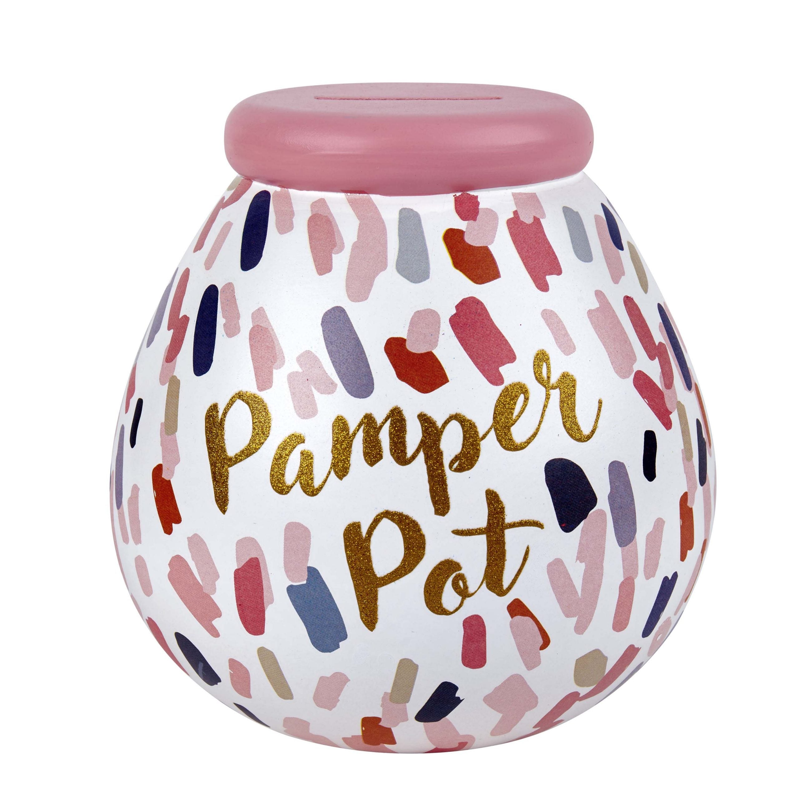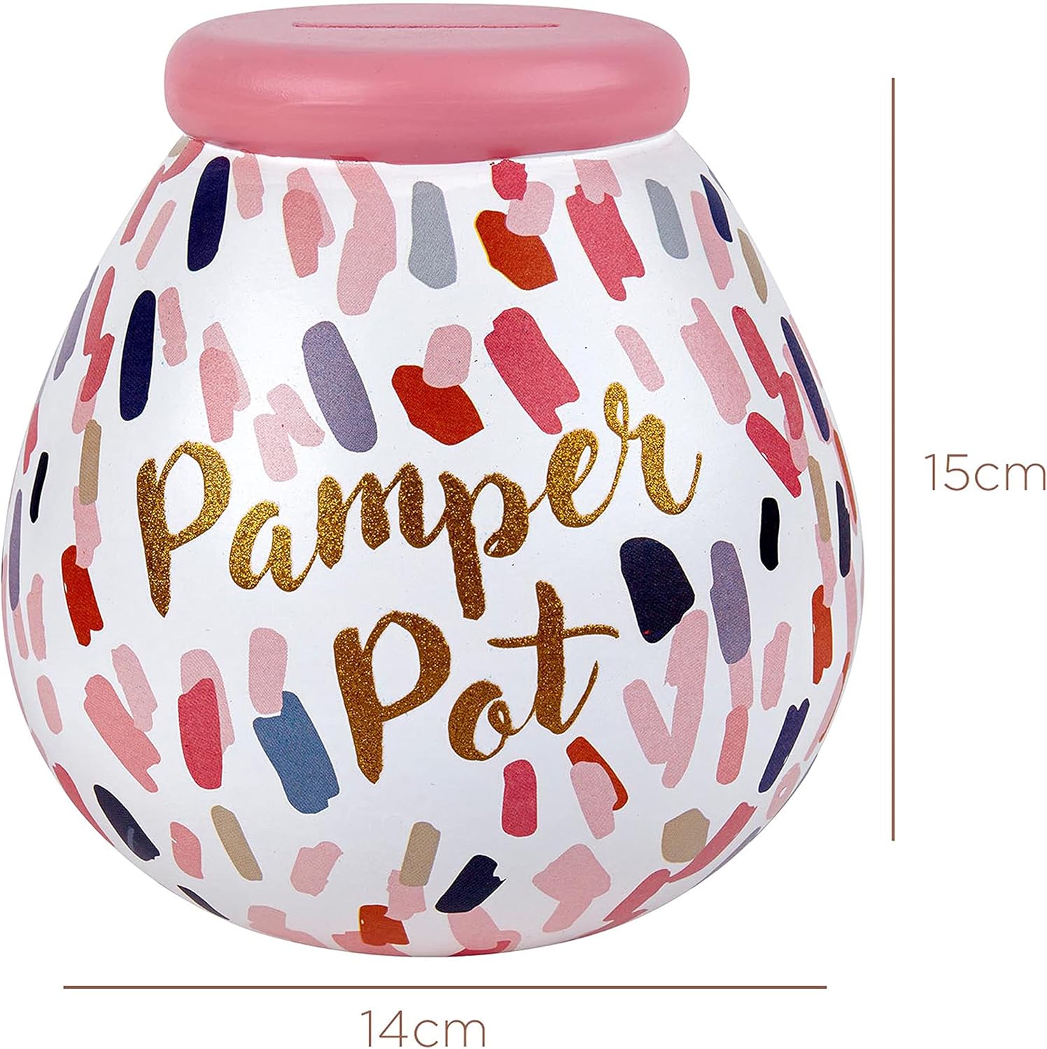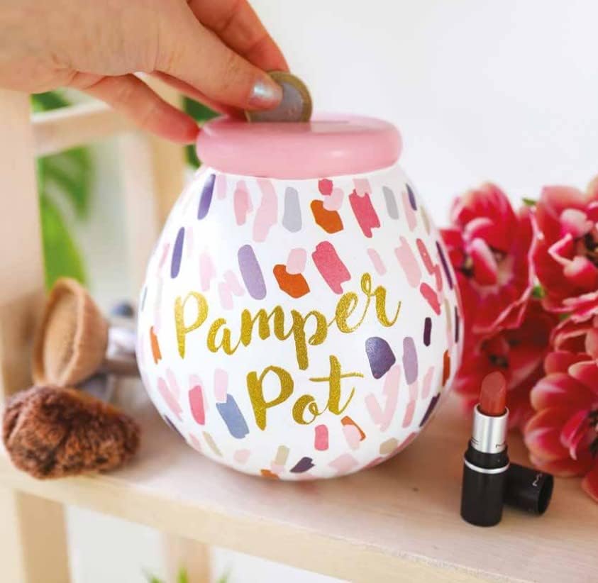 This chic ceramic money pot features a bold, smudged lipstick print with shimmering gold script that reads “Pamper Pot,” making it a stylish and empowering addition to your vanity or bedside. Perfect for saving towards spa days, beauty treats, or luxurious cosmetics, it holds up to £1000 in £1 coins.