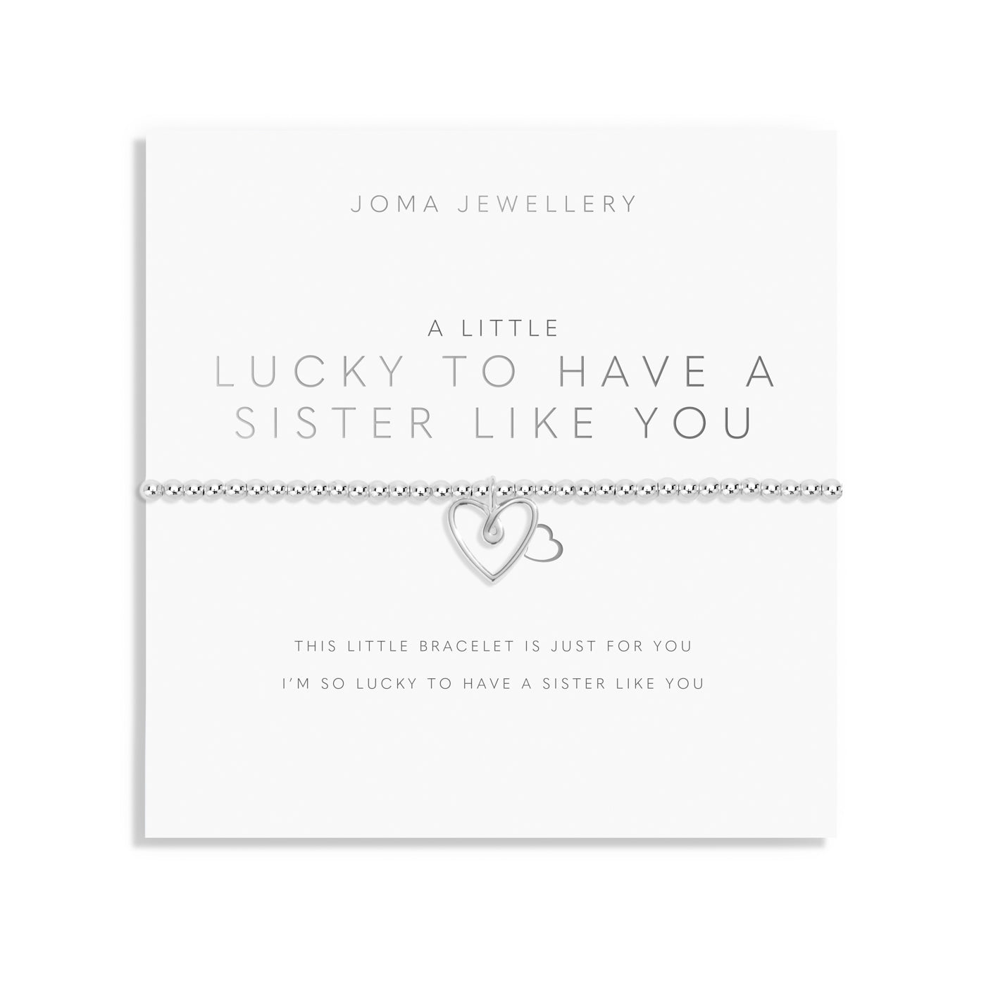 The Joma Jewellery A Little 'Lucky To Have A Sister Like You' Bracelet is a heartfelt way to celebrate the special bond between sisters. Designed with Joma's signature beaded stretch fit, this silver-plated bracelet features a delicate heart charm, symbolizing love and appreciation. Beautifully presented on a sentiment-stamped card with the meaningful message: