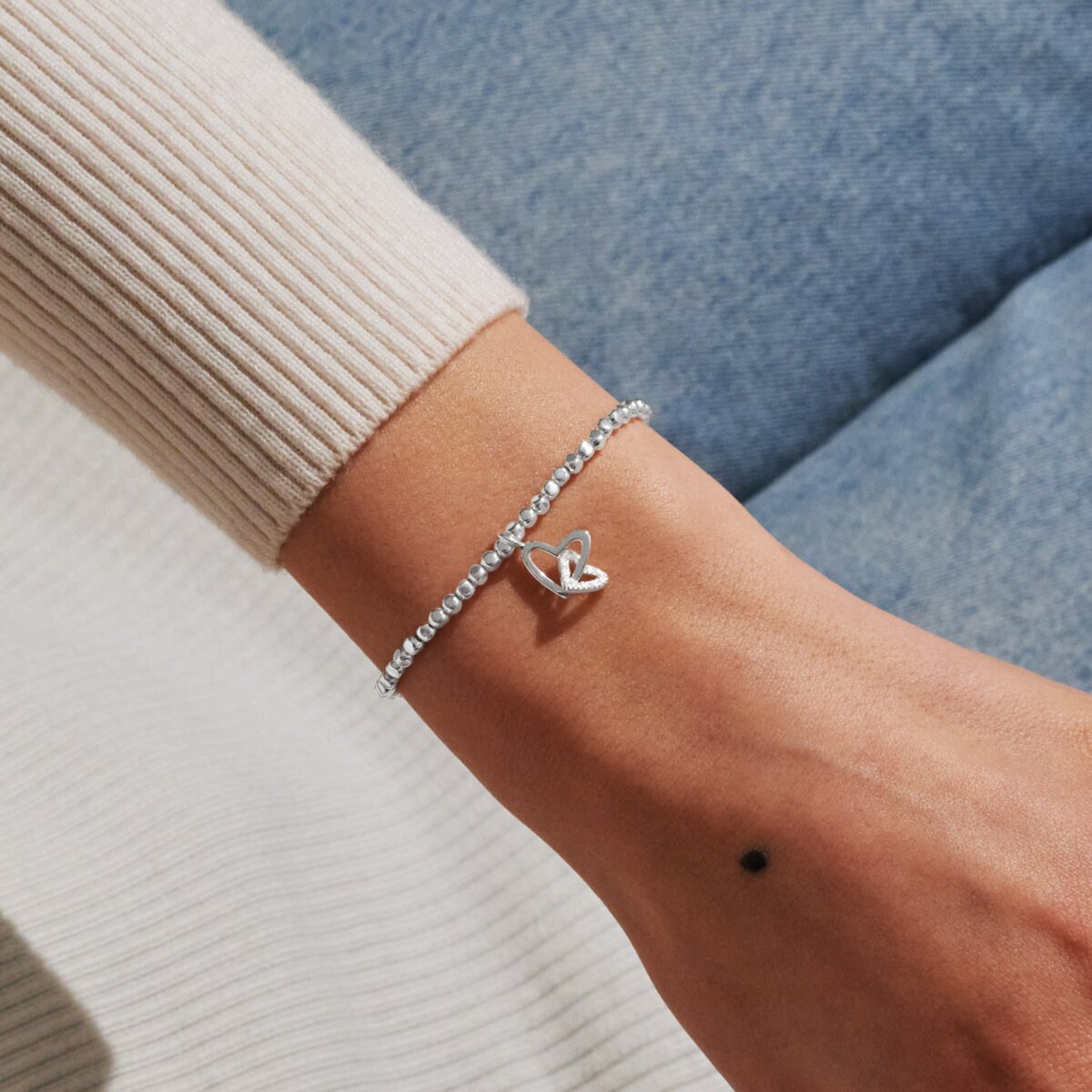 This beautiful keepsake is designed to celebrate the unconditional love between parent and child. The bracelet features lustrous silver-plated hammered beads and a stunning interlocked heart charm, serving as a daily reminder of your unbreakable bond.