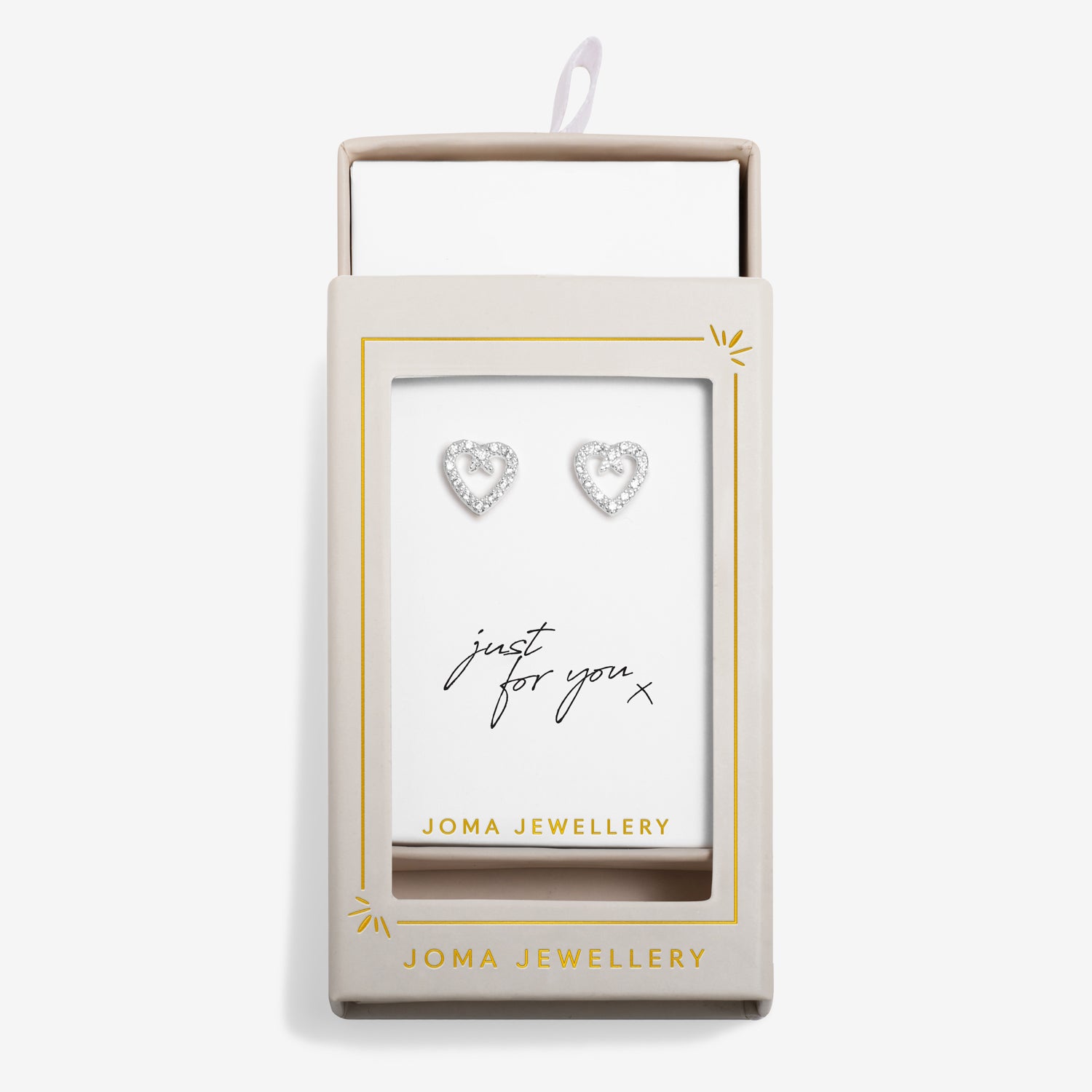 These silver-plated stud earrings feature sparkling pavé heart designs set with cubic zirconia, combining elegance and sentiment in one timeless piece. Finished with sterling silver pins, they’re presented in a matchbox-style gift box with a ribbon pull and delicate gold foil detailing. The heartfelt message “just for you x” makes this a perfect gift for anniversaries, birthdays, or simply to express your love, creating a keepsake that will be treasured forever.