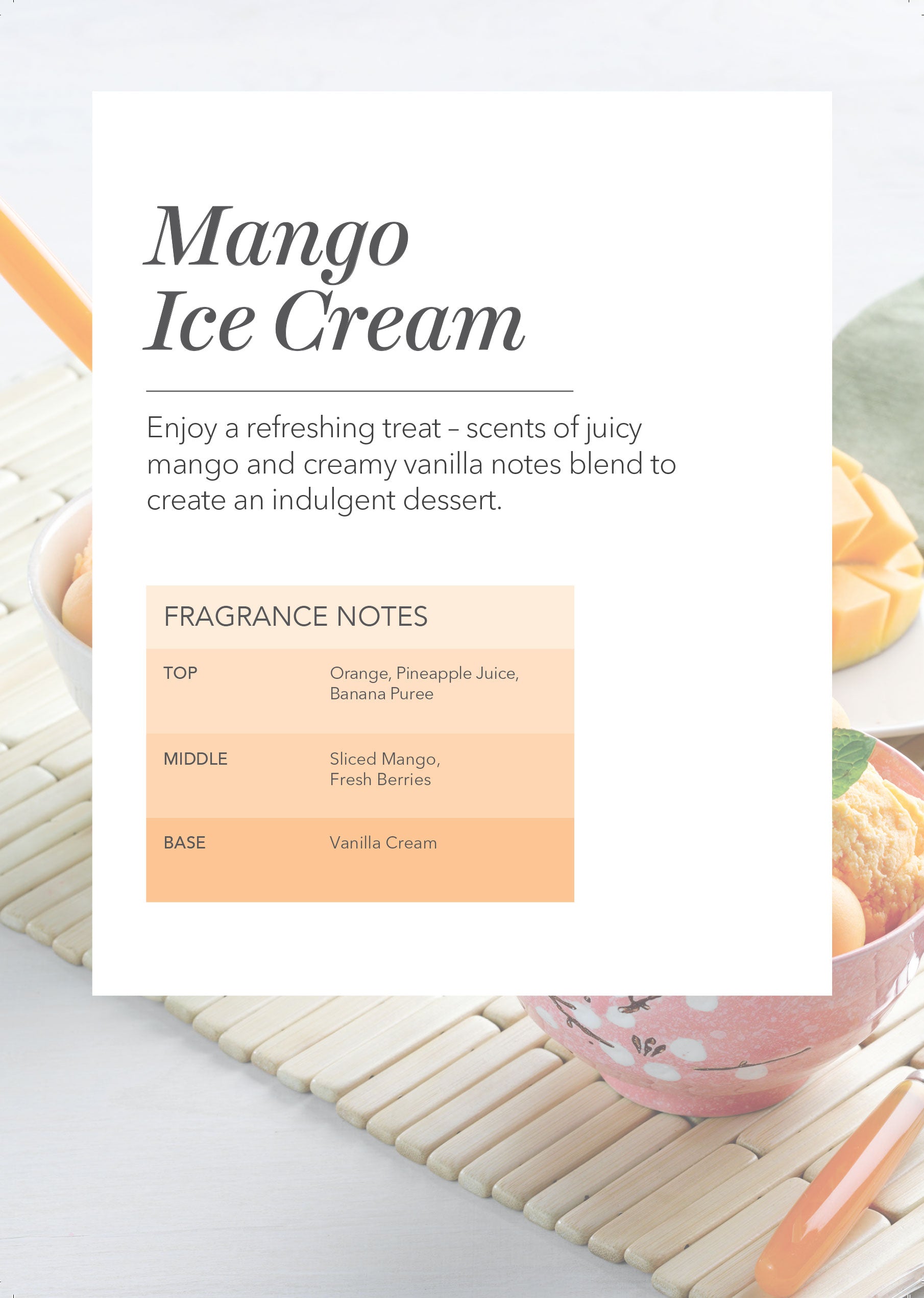 Enjoy a refreshing treat – scents of juicy mango and creamy vanilla notes blend to create an indulgent dessert.