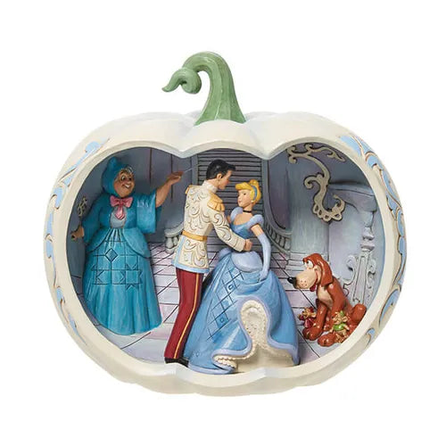 The Disney Traditions Cinderella Movie Scene Figurine showcases a beautiful scene of Cinderella and Prince Charming romantically waltzing, with the beloved Fairy Godmother, Bruno the Bloodhound and Jaq and Gus watching in awe at their beauty. Surrounding them is an intricately decorated, white pumpkin with a palace interior that reflects the magical storyline perfectly.