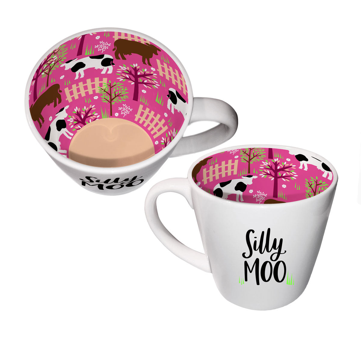 Inside Out mugs were inspired by the quote "it's what's on the inside that counts", from the initial glance they look like any other mug, however when you take a closer look the inside is where the magic happens! Carefully decorated the interior of the mugs contiunue the theme from the outside in this instance the outside reads "Silly Moo" and the inside is decorated with cows and the country theme.