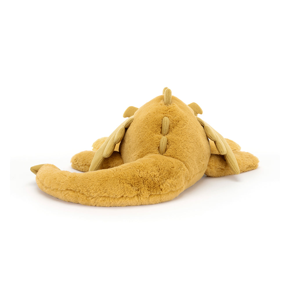 Meet a mythical friend with a heart of gold – the Jellycat Golden Dragon. This magical companion is irresistibly soft, featuring ochre-hued fur, a long, curved tail, and shimmering jersey spines, ears, and wings. Whether perched proudly on a shelf or snuggled up for a storytime snooze, Golden Dragon is a legendary cuddle buddy who promises to protect their little hoard of friends with love and care.