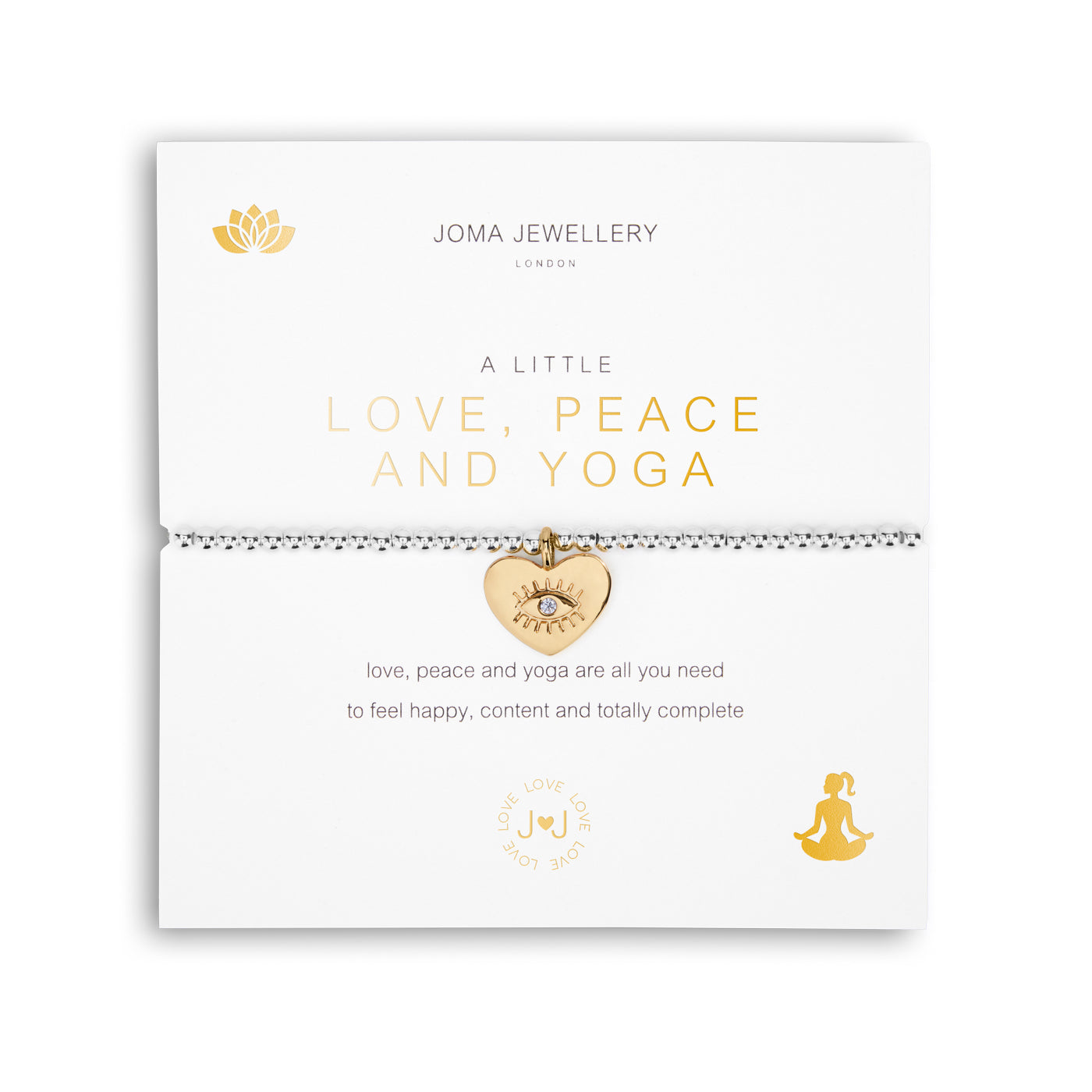 The A Little 'Love, Peace And Yoga' Bracelet makes the perfect 'just because' gift. Featuring a silver-plated design and is decorated with a golden heart-shaped charm. Perfectly presented, the bracelet is wrapped around one of our signature cards and framed by a sweet sentiment.