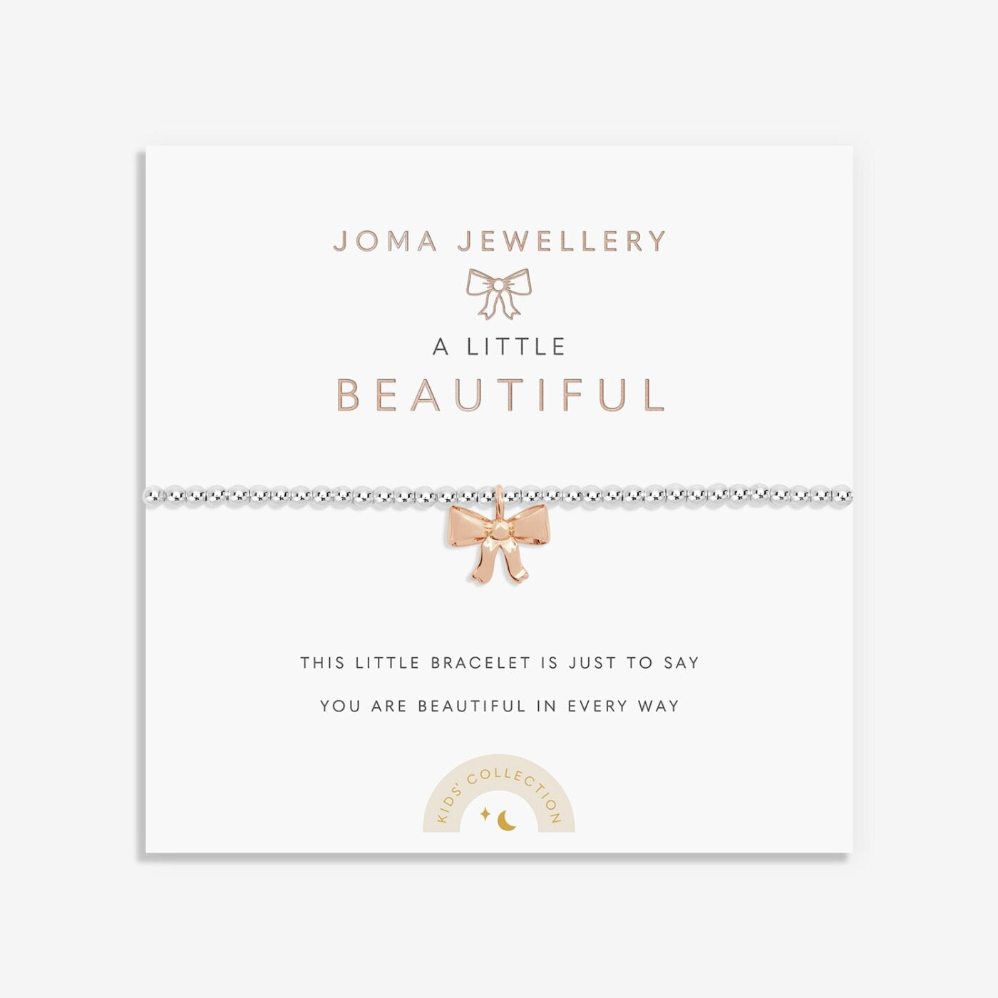 Crafted with a silver-plated stretch design for smaller wrists, a captivating rose gold-plated bow charm, and a sentiment-stamped card, this bracelet is more than jewellery—it's a declaration of their beauty in every way.