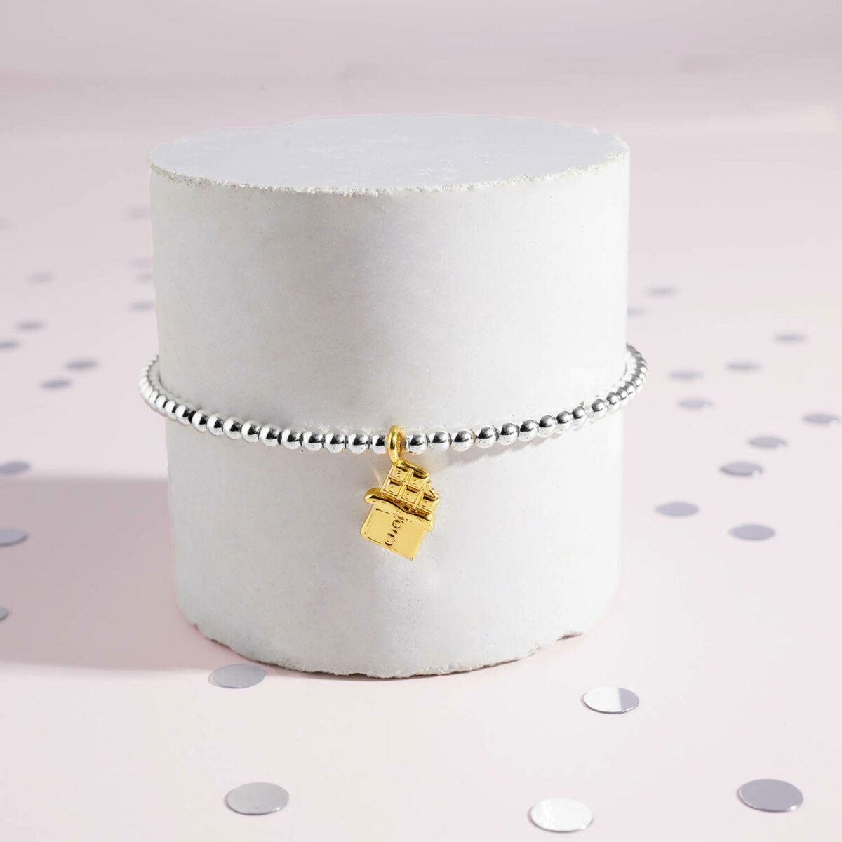 Featuring silver-plated beads with a stretch design, and a gold chocolate bar charm.