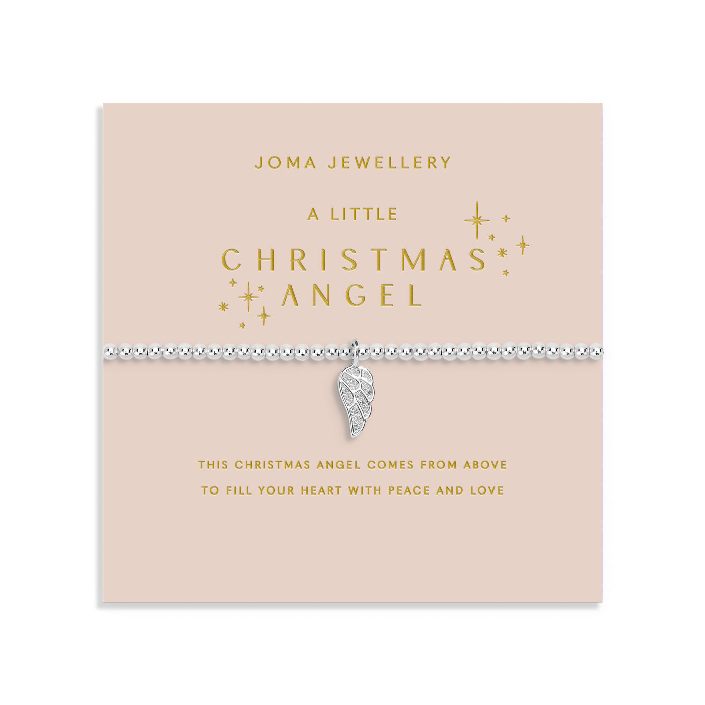 Adorned with radiant silver-plated beads and a delicate angel wing charm, this sentimental piece is a symbol of peace, love, and festive magic. Presented on a blush starburst card, it’s the perfect keepsake to warm hearts this season. With a comfortable 17.5cm stretch fit, it’s a thoughtful and elegant gift for someone truly special.