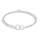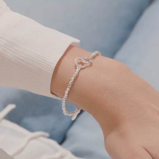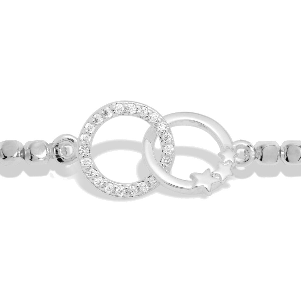Lovingly crafted in silver plating, this elegant bracelet features a unique hammered bead design and two interlocked circles adorned with sparkling pavé stars, symbolising love and wishes coming true.