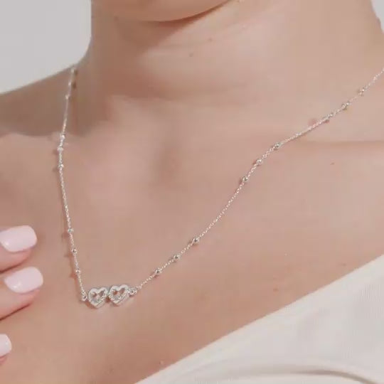 Crafted with care, this necklace features a classic silver-plated clasp chain that exudes timeless elegance. The highlight is the engraved 'love you more' double heart charm, symbolizing the infinite bond between two hearts. Wrapped around a blush pink card with the heartfelt sentiment "This necklace is yours to adore, everyday I love you more," it's a romantic gesture that speaks volumes.