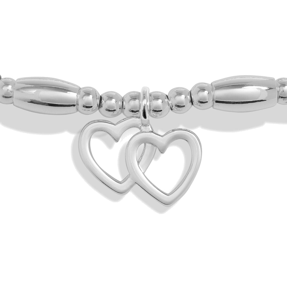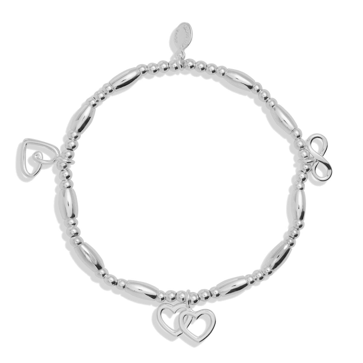 This elegant silver-plated bracelet features alternating round and oval beads, complemented by heart and infinity charms that symbolise love and forever friendship. Designed with care and love, it arrives in a gorgeous buttercream and blush pink gift box, making it the perfect present for someone who holds a special place in your heart. With its delicate design and meaningful charms, this 17.5cm stretch bracelet is a beautiful reminder of the unbreakable bond you share with your dearest friends.