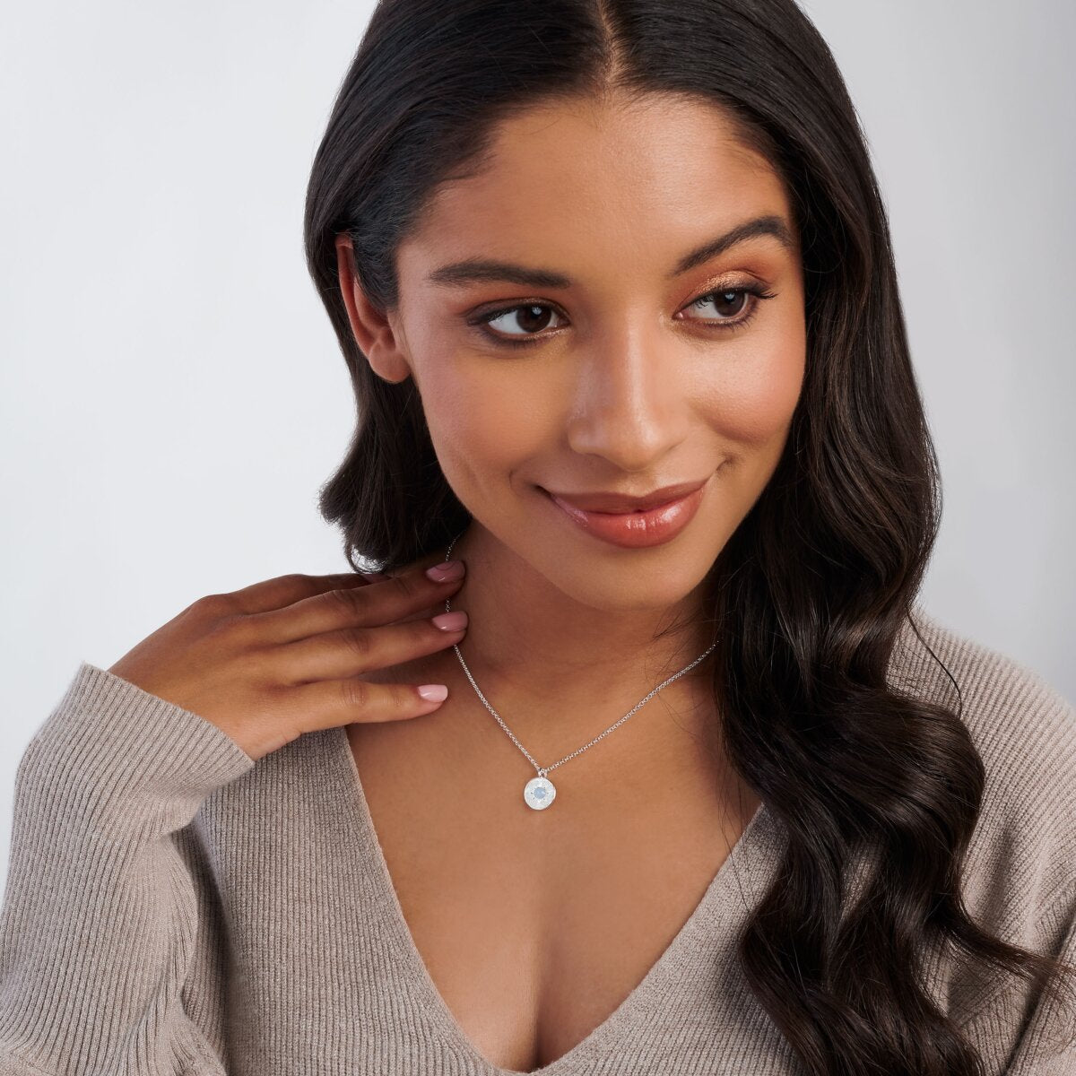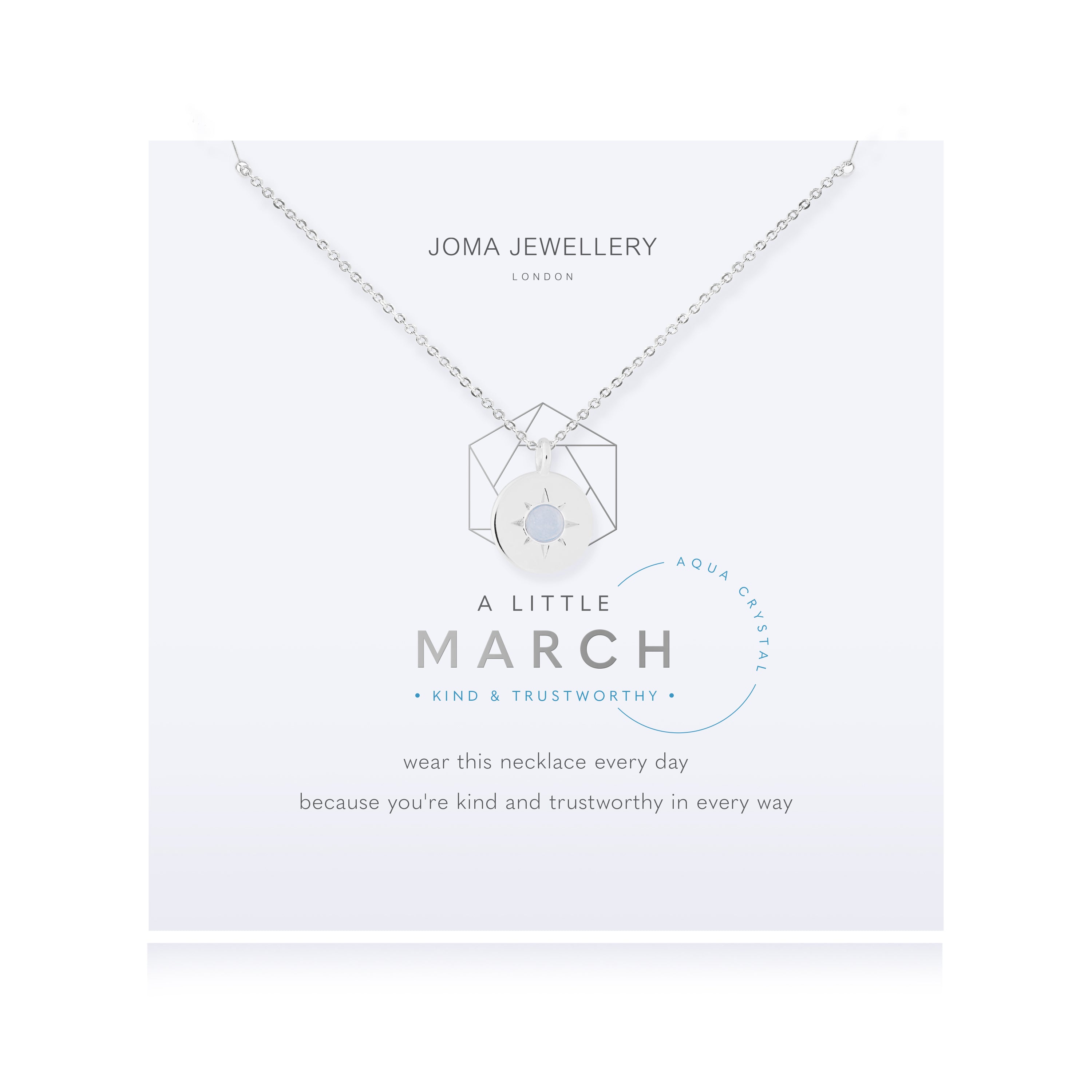 Celebrate a March birthday in the most special way with our March Aqua Crystal Birthstone 'A Little' Necklace! This silver-plated necklace includes a small disc charm with a real semi-precious gemstone at the centre to reflect a kind and trustworthy nature. You'll never want to take it off!